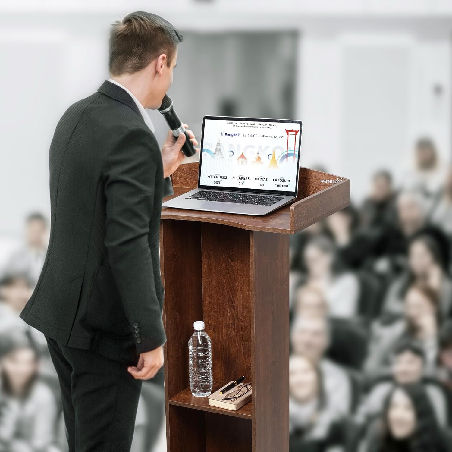 - 𝑴𝒐𝒓𝒆 𝑺𝒑𝒂𝒄𝒆: The podium includes 2 levels of open storage space where speakers can conv